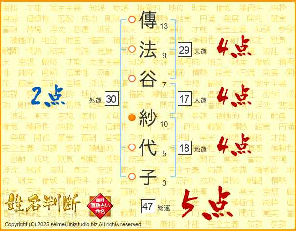 生活面を象徴する運勢です。外部から受ける影響力を表し、結婚運、家庭運や職場、環境への順応性を表します。総運から人運を引いた画数。姓や名が1文字の場合を除く。