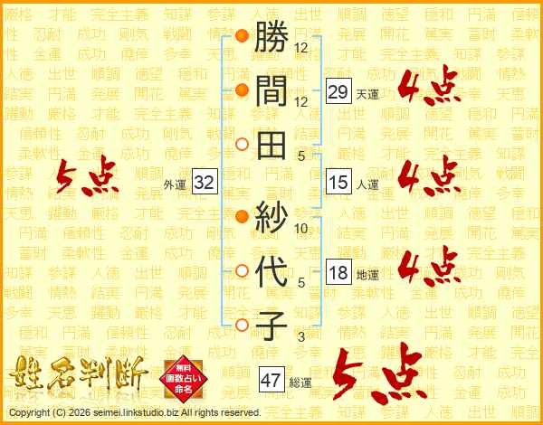 勝(12画)間(12画)田(5画) 紗(10画)代(5画)子(3画)