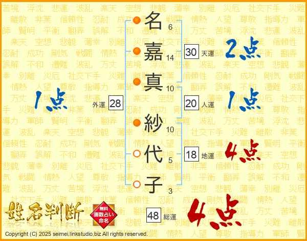 名(6画)嘉(14画)真(10画) 紗(10画)代(5画)子(3画)