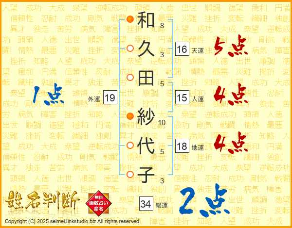 和(8画)久(3画)田(5画) 紗(10画)代(5画)子(3画)