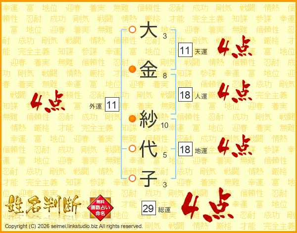 大(3画)金(8画) 紗(10画)代(5画)子(3画)