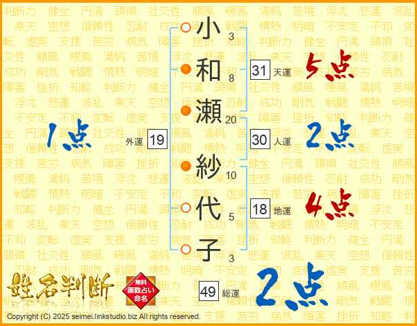 小(3画)和(8画)瀬(20画) 紗(10画)代(5画)子(3画)
