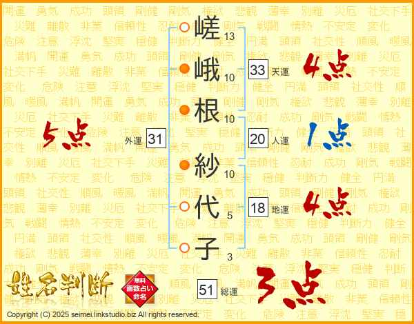 嵯(13画)峨(10画)根(10画) 紗(10画)代(5画)子(3画)