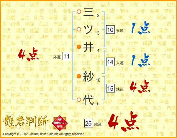 三(3画)ツ(3画)井(4画) 紗(10画)代(5画)