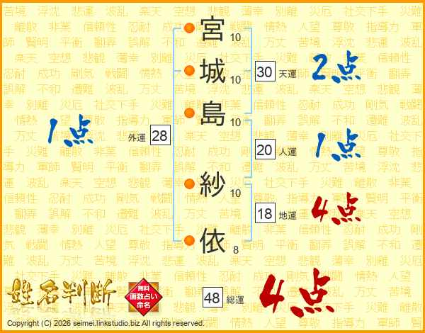 宮(10画)城(10画)島(10画) 紗(10画)依(8画)