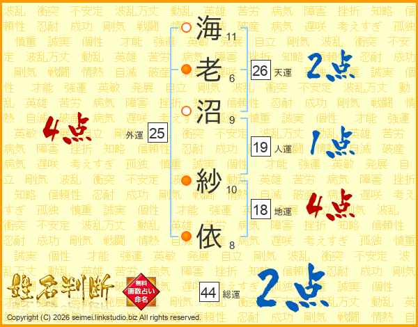 海(11画)老(6画)沼(9画) 紗(10画)依(8画)
