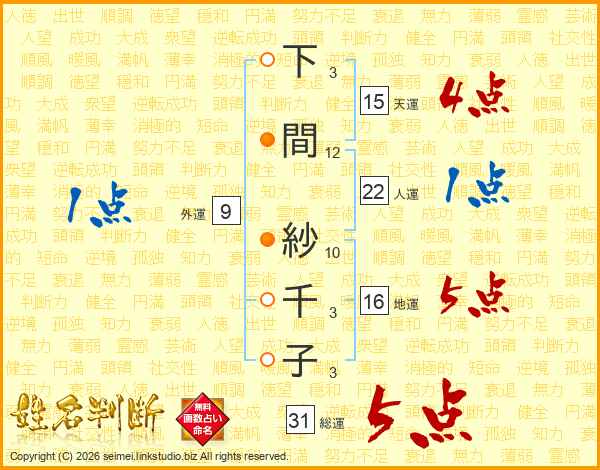 下間紗千子さんの総運は31画の5点!
