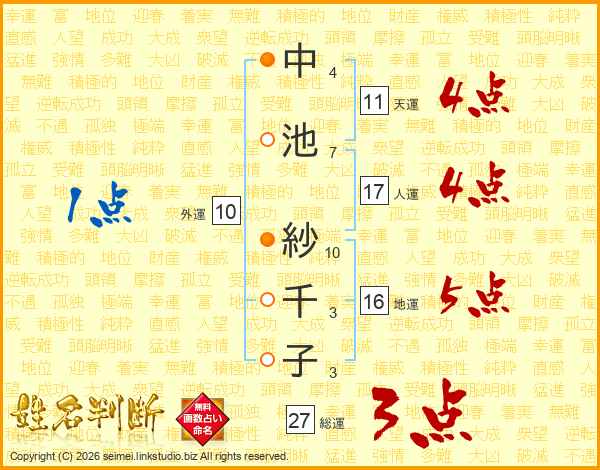 中(4画)池(7画) 紗(10画)千(3画)子(3画)