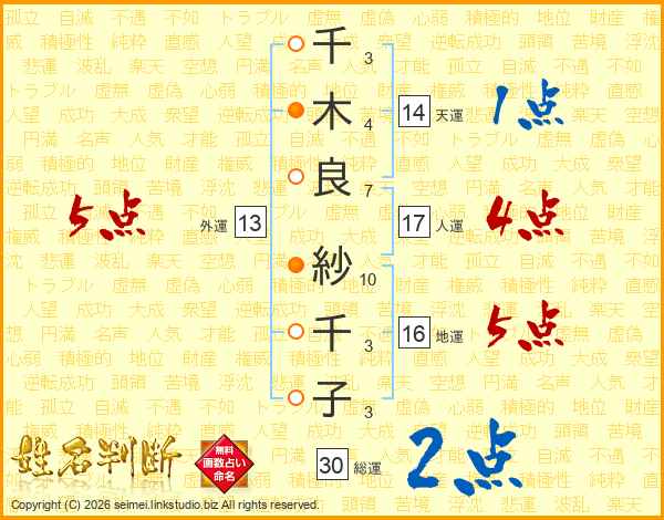 千(3画)木(4画)良(7画) 紗(10画)千(3画)子(3画)