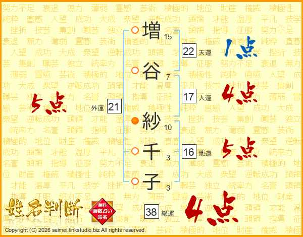 増(15画)谷(7画) 紗(10画)千(3画)子(3画)