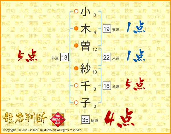 小木曽紗千子さんの外運は13画の5点!