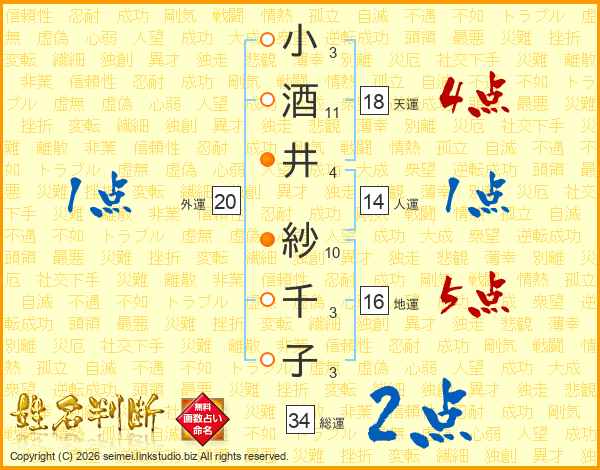 小(3画)酒(11画)井(4画) 紗(10画)千(3画)子(3画)