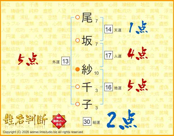 尾(7画)坂(7画) 紗(10画)千(3画)子(3画)
