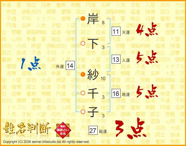 岸(8画)下(3画) 紗(10画)千(3画)子(3画)