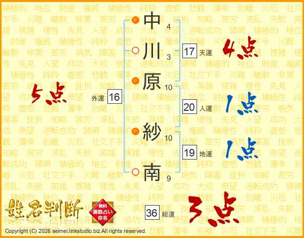 中(4画)川(3画)原(10画) 紗(10画)南(9画)