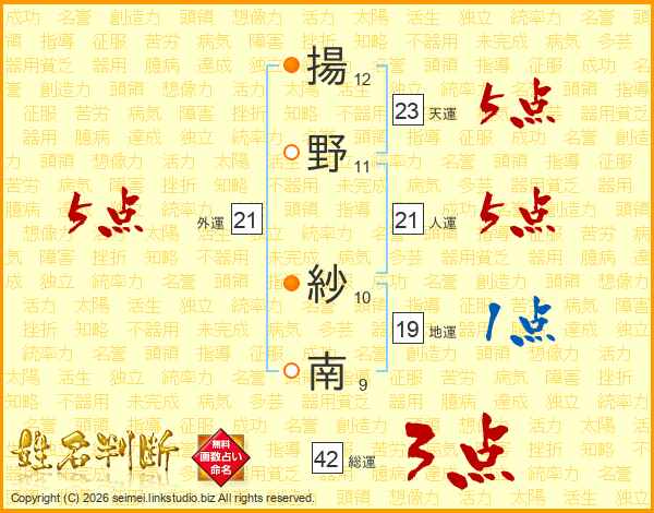 生活面を象徴する運勢です。外部から受ける影響力を表し、結婚運、家庭運や職場、環境への順応性を表します。総運から人運を引いた画数。姓や名が1文字の場合を除く。