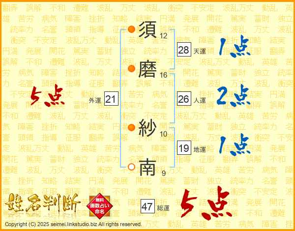 あなたの人生を表す1番重要な運勢です。生涯を通じて影響する総合運となり、主に50歳以降の晩年期に影響を及ぼします。苗字と名前の合計画数。