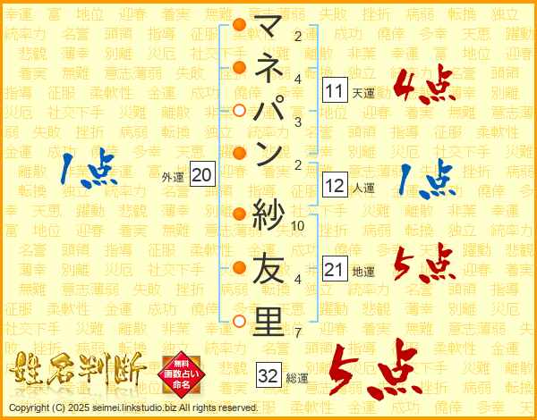マ(2画)ネ(4画)パ(3画)ン(2画) 紗(10画)友(4画)里(7画)