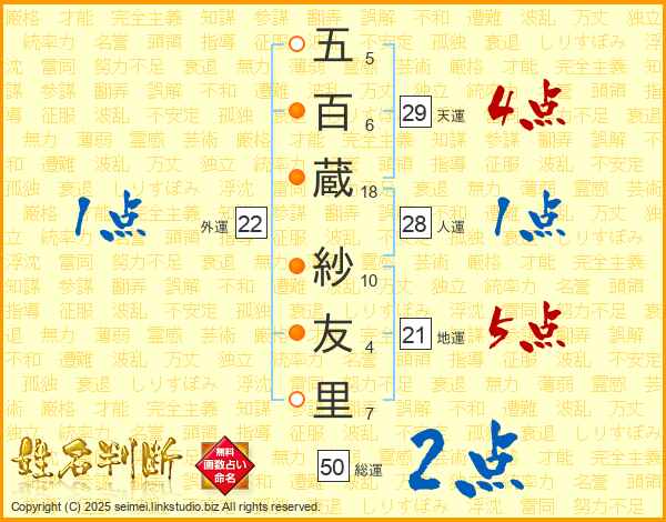 五(5画)百(6画)蔵(18画) 紗(10画)友(4画)里(7画)