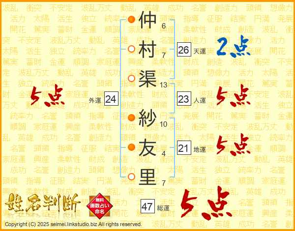 仲(6画)村(7画)渠(13画) 紗(10画)友(4画)里(7画)