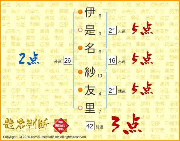 伊(6画)是(9画)名(6画) 紗(10画)友(4画)里(7画)