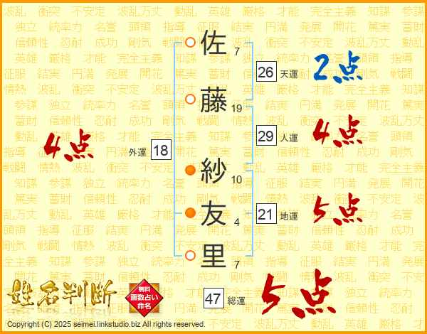 佐(7画)藤(19画) 紗(10画)友(4画)里(7画)