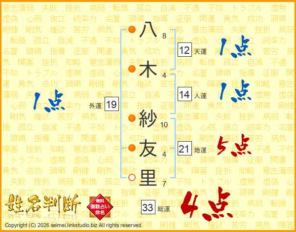 八木紗友里さんの総運は33画の4点!