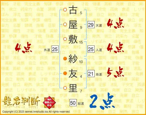 古(5画)屋(9画)敷(15画) 紗(10画)友(4画)里(7画)