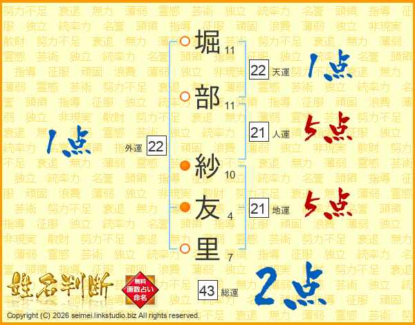 堀(11画)部(11画) 紗(10画)友(4画)里(7画)