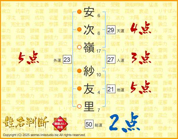 安(6画)次(6画)嶺(17画) 紗(10画)友(4画)里(7画)