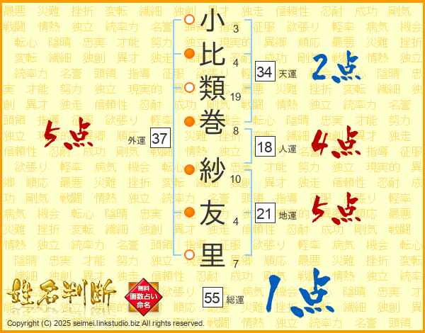 小(3画)比(4画)類(19画)巻(8画) 紗(10画)友(4画)里(7画)
