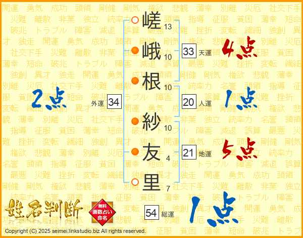 嵯(13画)峨(10画)根(10画) 紗(10画)友(4画)里(7画)