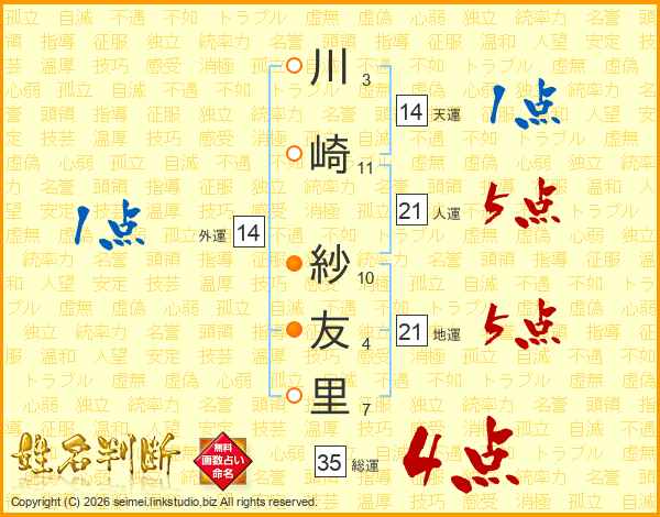 川(3画)崎(11画) 紗(10画)友(4画)里(7画)