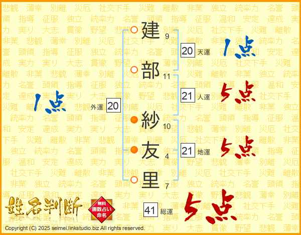建(9画)部(11画) 紗(10画)友(4画)里(7画)