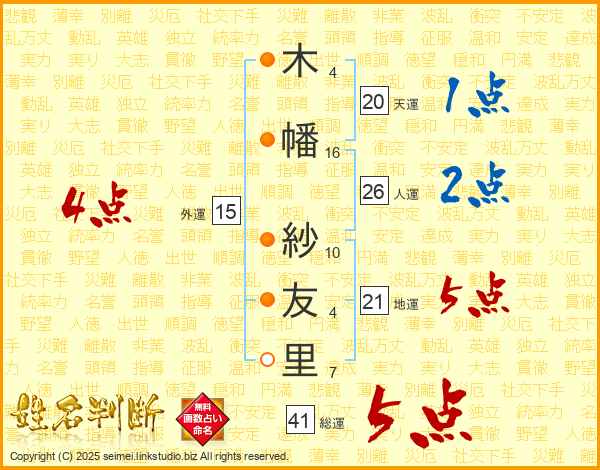 木(4画)幡(16画) 紗(10画)友(4画)里(7画)