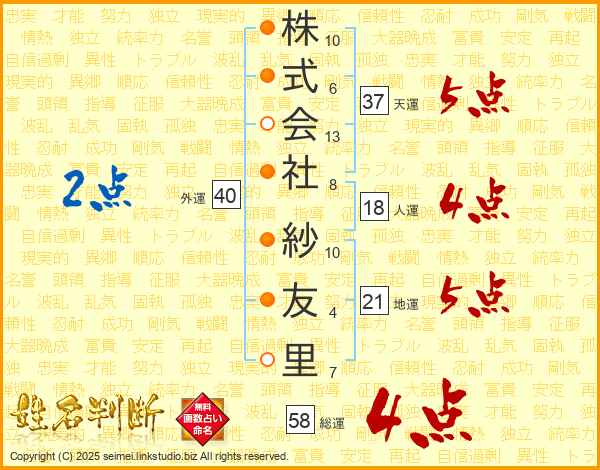 株式会社紗友里さんの天運は37画の5点!
