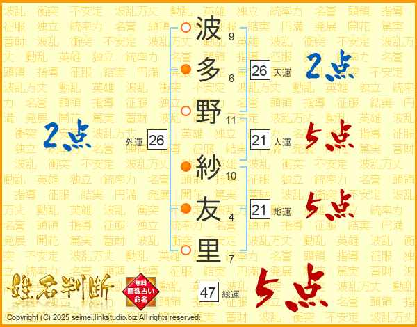 波(9画)多(6画)野(11画) 紗(10画)友(4画)里(7画)
