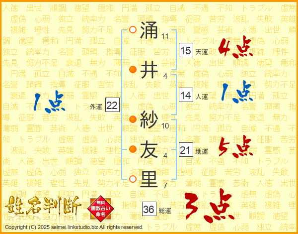 涌(11画)井(4画) 紗(10画)友(4画)里(7画)