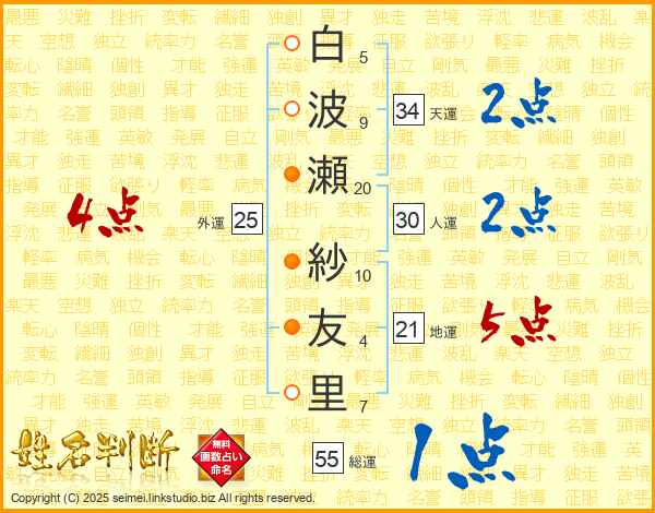 白(5画)波(9画)瀬(20画) 紗(10画)友(4画)里(7画)