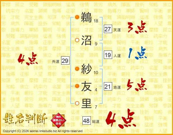 鵜(18画)沼(9画) 紗(10画)友(4画)里(7画)