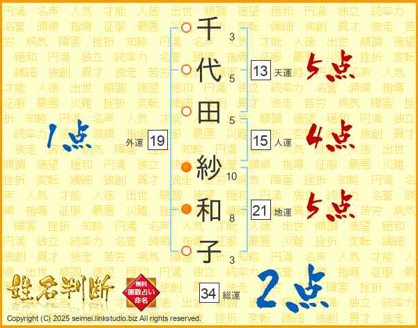 千(3画)代(5画)田(5画) 紗(10画)和(8画)子(3画)