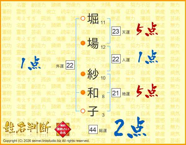 堀(11画)場(12画) 紗(10画)和(8画)子(3画)