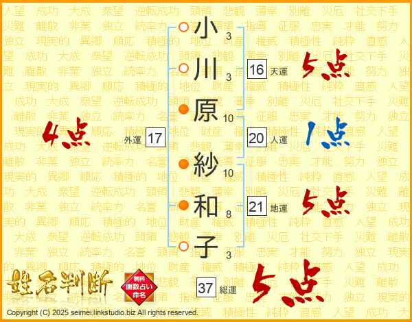 生活面を象徴する運勢です。外部から受ける影響力を表し、結婚運、家庭運や職場、環境への順応性を表します。総運から人運を引いた画数。姓や名が1文字の場合を除く。