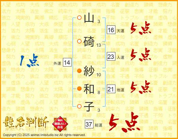 山(3画)碕(13画) 紗(10画)和(8画)子(3画)