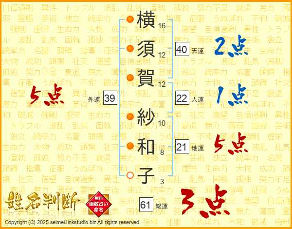 横(16画)須(12画)賀(12画) 紗(10画)和(8画)子(3画)