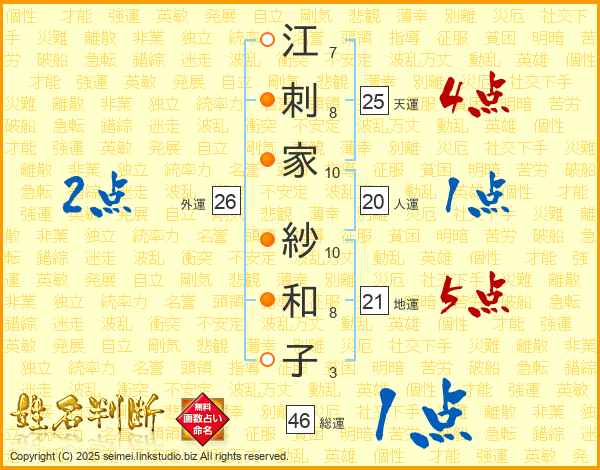 江(7画)刺(8画)家(10画) 紗(10画)和(8画)子(3画)