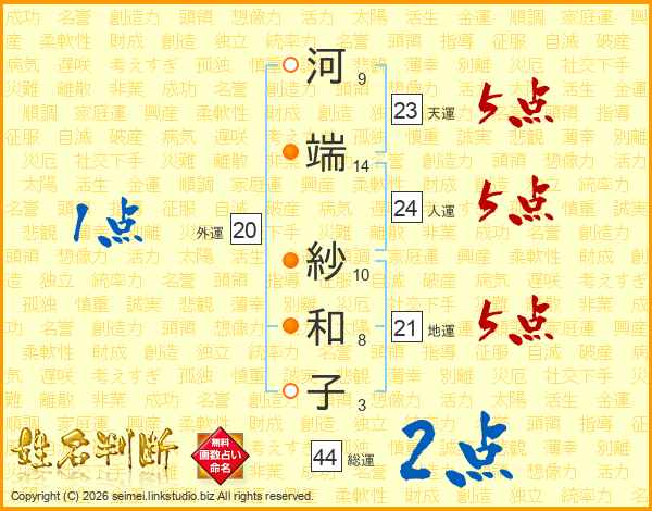 河端紗和子さんの総運は44画の2点!