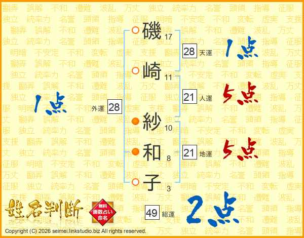 磯(17画)崎(11画) 紗(10画)和(8画)子(3画)