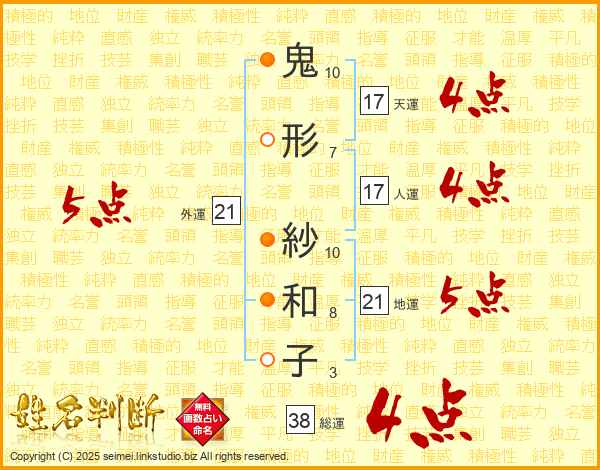 鬼(10画)形(7画) 紗(10画)和(8画)子(3画)