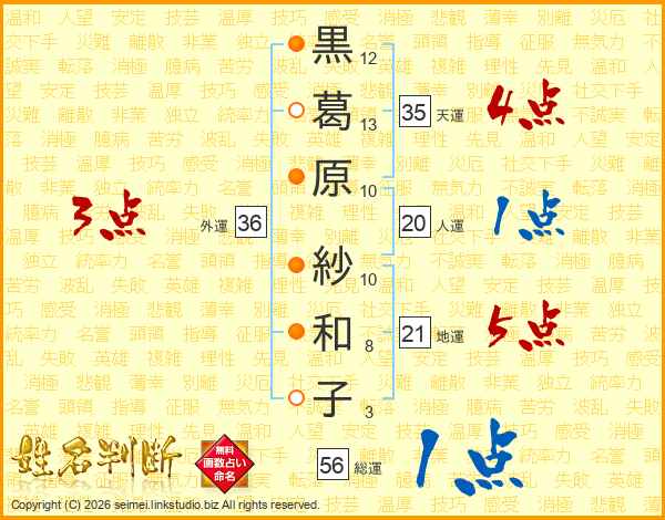 黒葛原紗和子さんの総運は56画の1点!
